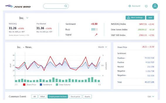 于洋在會上展示了中譯語通的最新金融大數(shù)據(jù)產(chǎn)品JoveBird(卓英),它是以金融分析模型和強大的跨語言大數(shù)據(jù)處理能力為基礎(chǔ)的智能金融投資分析引擎,為投資者提供最新的投資機會分析,并幫助投資者從全球角度制定最佳投資策略。JoveBird指數(shù)融合了20多項因子,包括傳統(tǒng)金融參數(shù)和可替代數(shù)據(jù)指標,這些數(shù)據(jù)呈現(xiàn)能夠幫助投資者了解市場上的真實事件,并將其作為現(xiàn)有評估模型的輸入數(shù)據(jù),消除信息不對稱風險,預(yù)測上市公司股價趨勢,有效實現(xiàn)超額回報。
